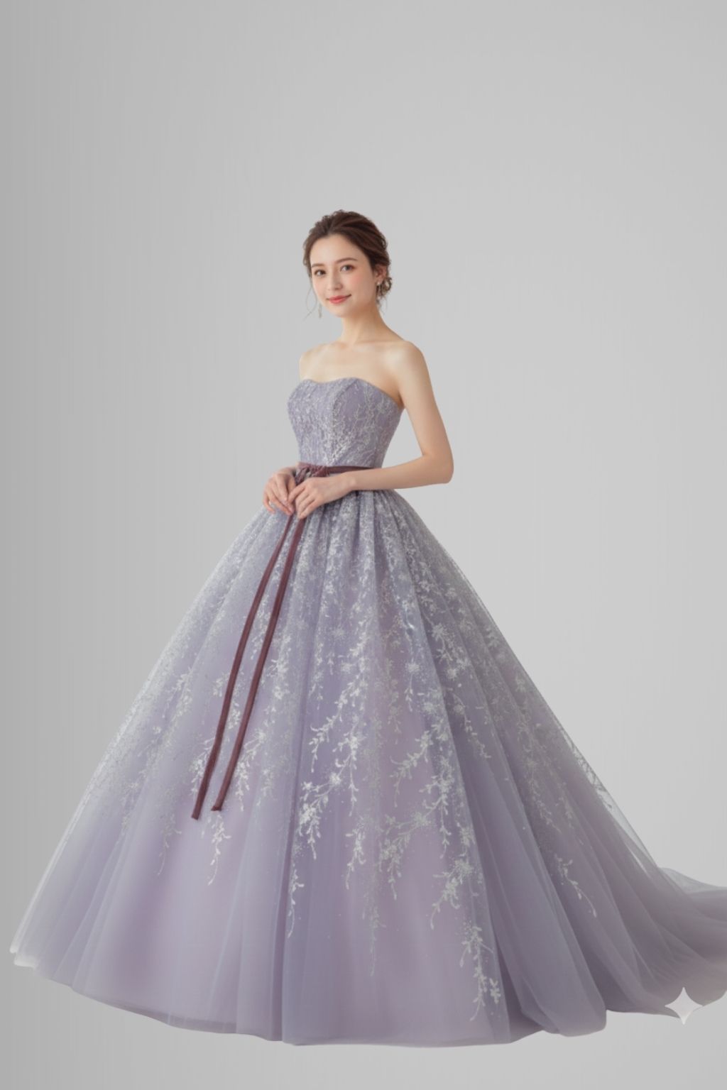 淡く優しいラベンダーカラーに、繊細な刺繍が広がるロマンティックな一着。