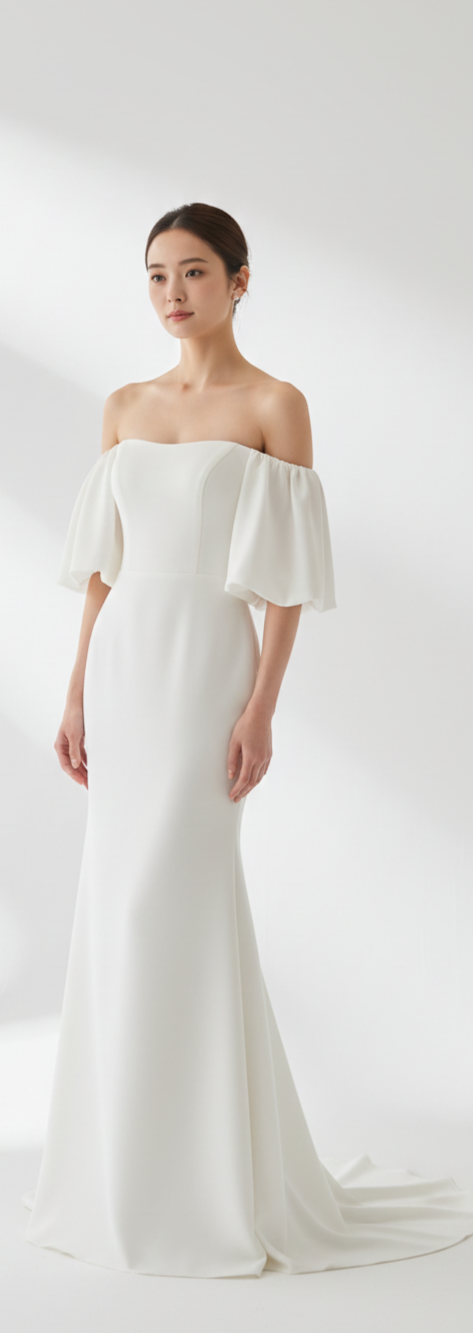 オフショルダーの袖が、肩やデコルテをやさしく引き立てます。