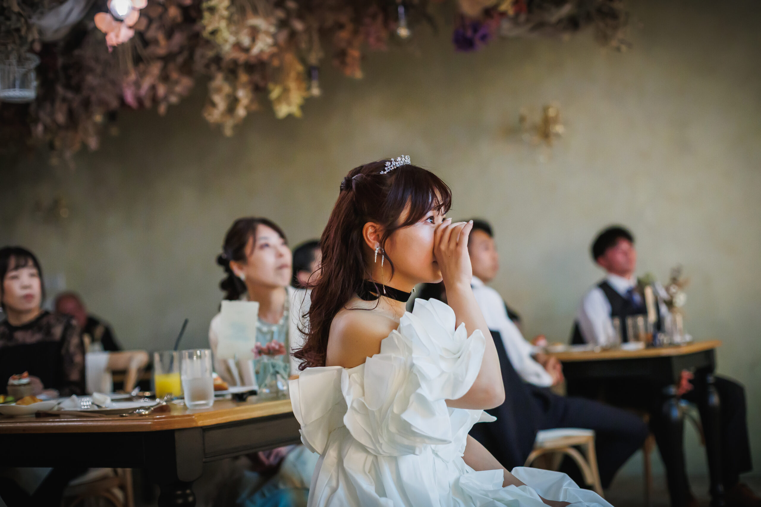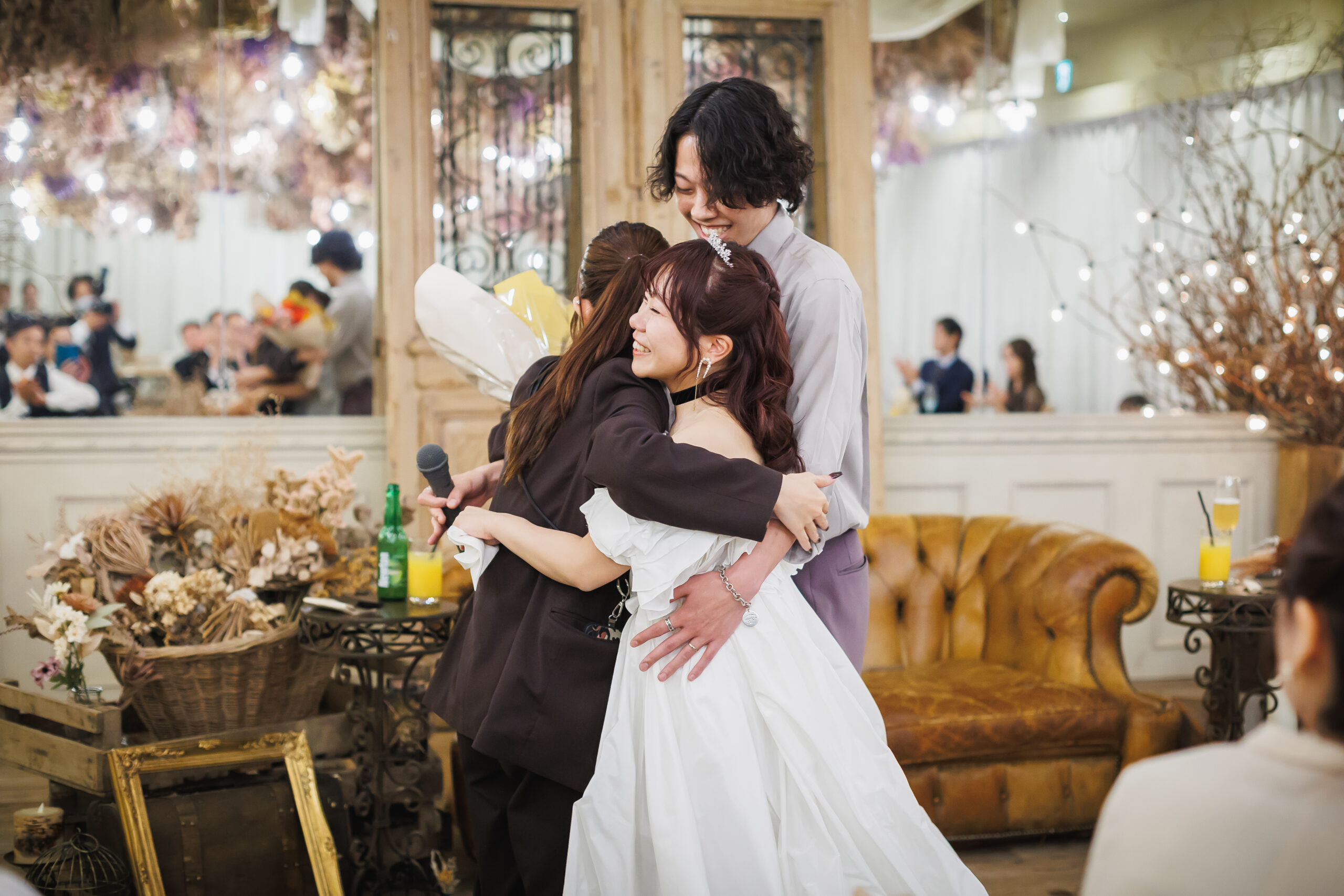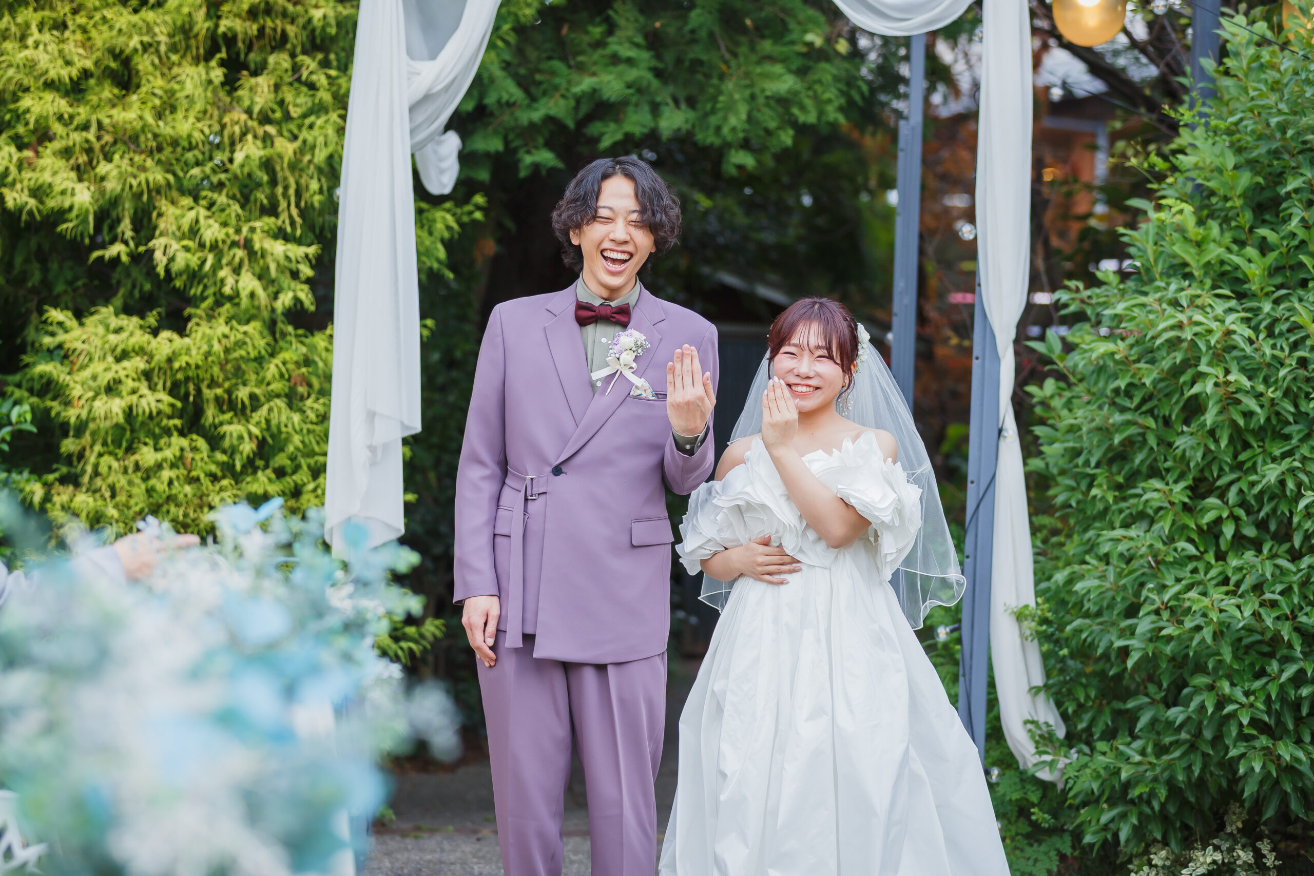 明るい優しさと、愛される笑顔 新郎様は、明るく優しい性格。新婦様のことが大好きな気持ちは、言葉にしなくても自然と伝わってくる ほどでした。 新婦様は、小動物のような愛らしさと、周りまで明るくする素敵な笑顔が魅力。男女問わず愛されるその 人柄に、会場は終始あたたかな空気に包まれていました。 友人期間が長かったからこそ、お互いを深く理解し合い、無理のない自然な姿が印象的でした。