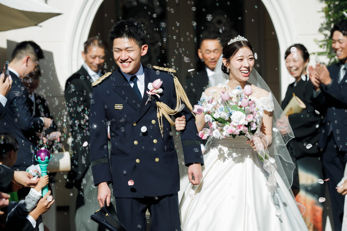 挙式のラストは、新郎様ならではのワンシーン。儀礼服姿にピッタリの”敬礼”で、ビシッとポーズ。その隣で新婦様もにこやかに敬礼を添えます。かっこよさの中にも、おふたりらしい明るさがあふれる瞬間。ゲストからも自然と笑顔と拍手が広がりました。