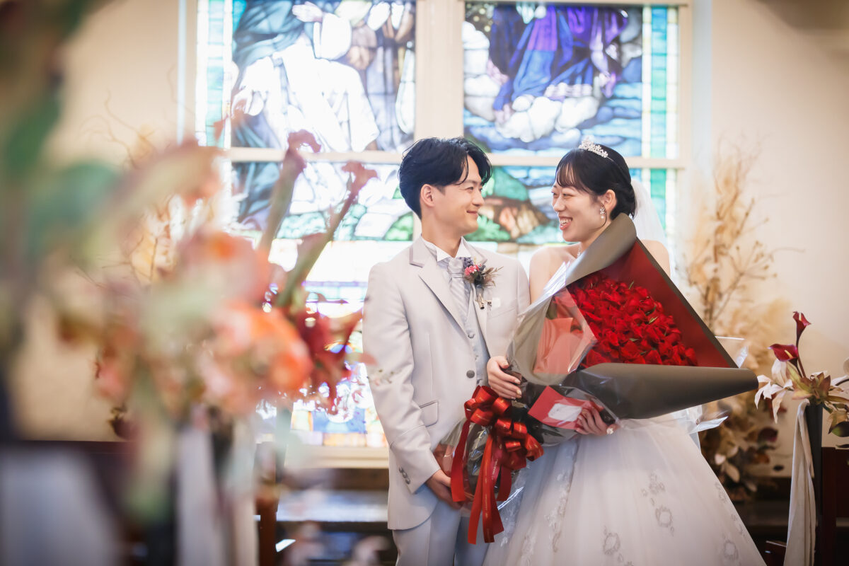 バラの花束を見た新婦様の表情が、驚きから笑顔へ変わるその一瞬。